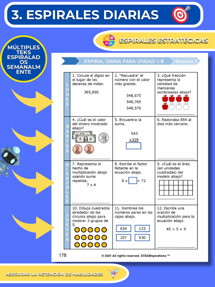 Espirales Diarias: Hemos estructurado nuestro programa de matemáticas para garantizar una revisión continua al volver a visitar todas las habilidades previamente enseñadas cada semana, asegurando así el dominio. Normalmente, para la séptima unidad, los estudiantes están revisando más de 15 habilidades quincenalmente, cubriendo todo el material de las primeras cuatro unidades. (Resaltar espiral diaria por TEKS)