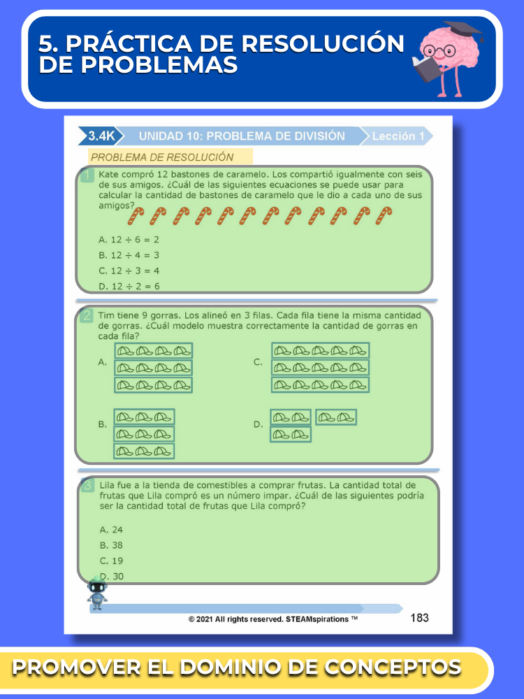 Preguntas de Resolución de Problemas: Más allá de las espirales diarias, cada lección incluye preguntas de resolución de problemas, también conocidas como preguntas del Problema del Día (P.O.D.), que refuerzan las habilidades de la lección enseñada previamente.