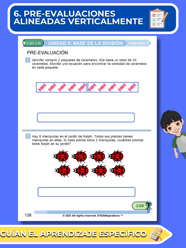 Pre-Evaluaciones Alineadas Verticalmente: Nuestro enfoque comienza cada unidad con una pre-evaluación sucinta que se alinea verticalmente con los nuevos TEKs introducidos, permitiendo un aprendizaje enfocado y efectivo.