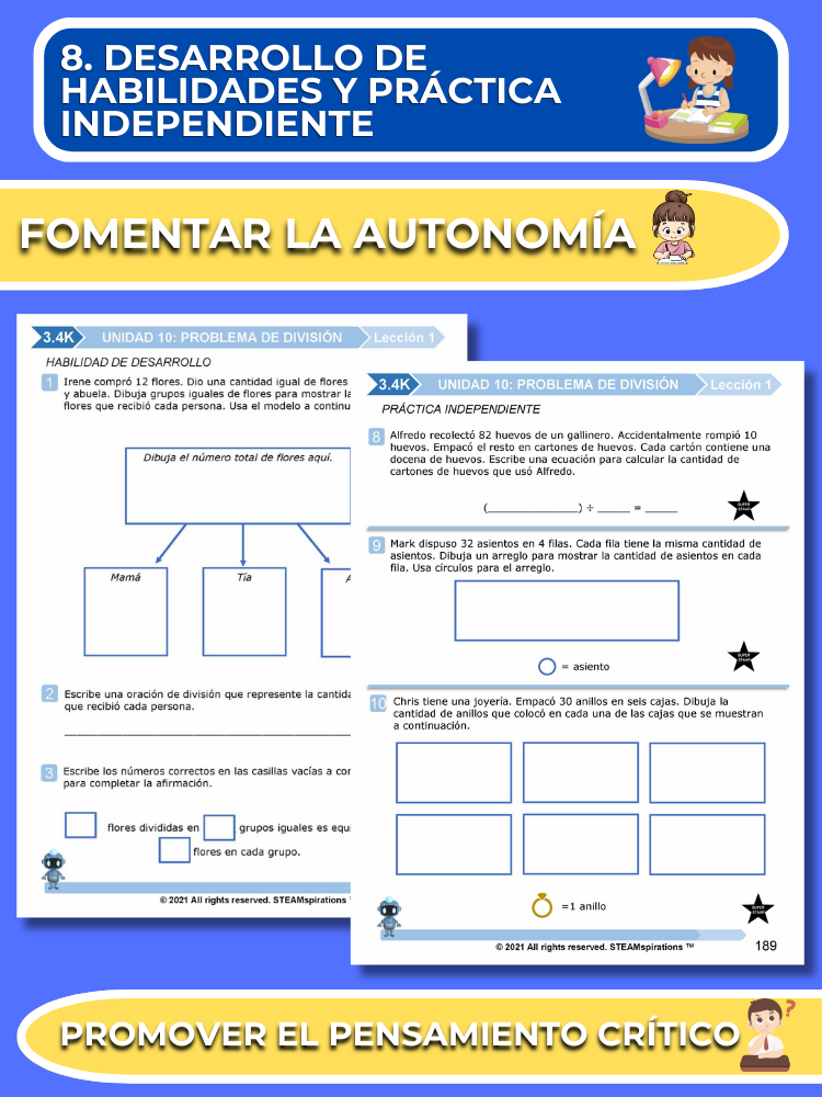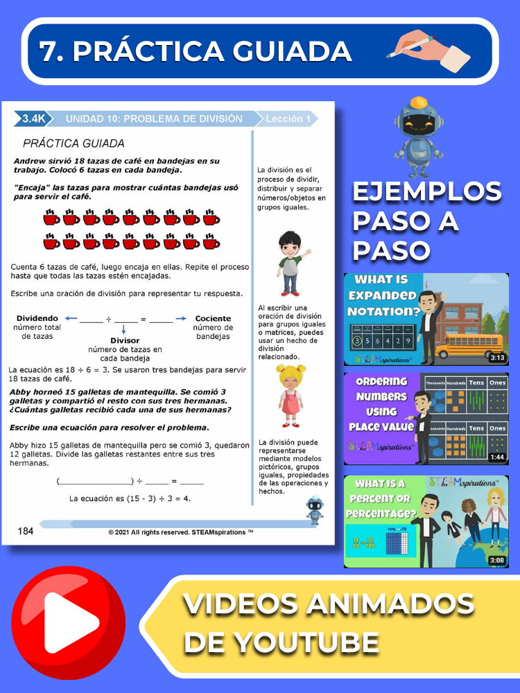Práctica Guiada: Cada unidad incluye secciones de práctica guiada diseñadas para enseñar efectivamente nuevos TEKs/Habilidades. Estas se pueden utilizar junto con nuestros atractivos videos de instrucción animados, mejorando la experiencia de aprendizaje.