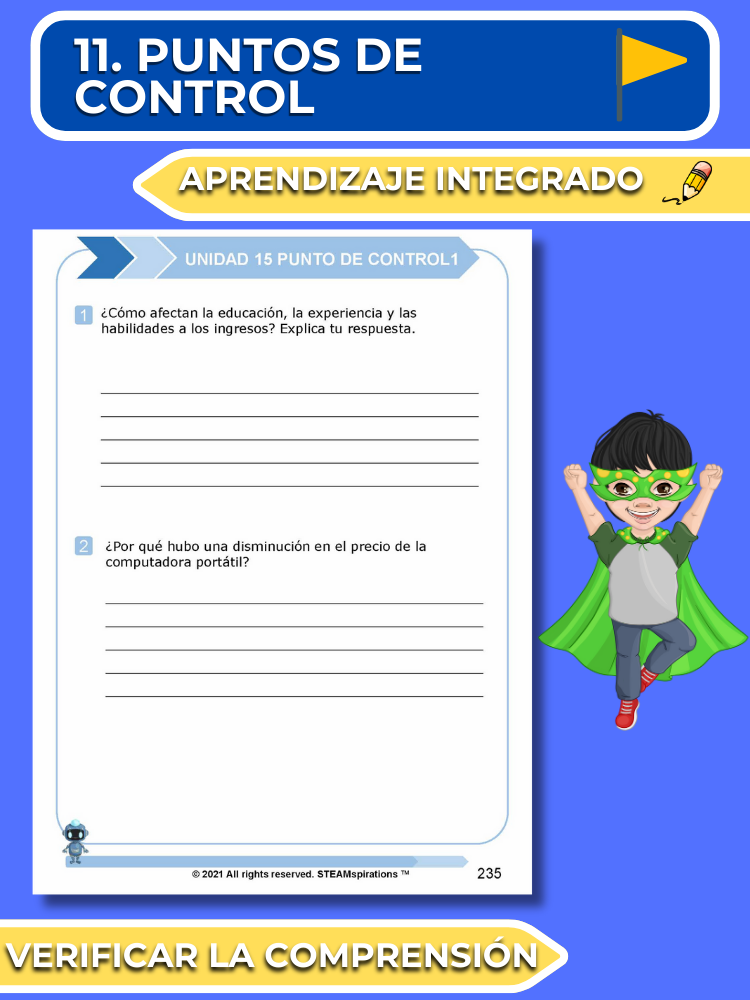Puntos de Control: Al final de cada lección, los puntos de control incluyen un ejercicio de escritura y una pregunta de resolución de problemas para evaluar la comprensión y consolidar el aprendizaje.