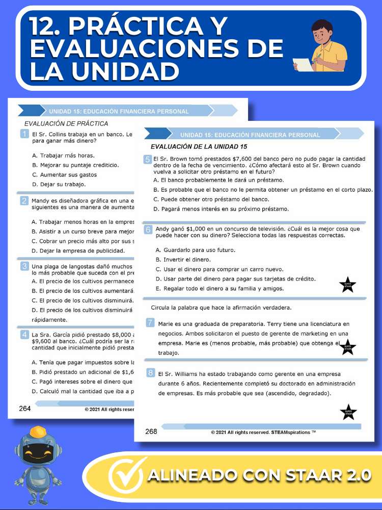 Prácticas y Evaluaciones de Unidades: Reflejando el rigor del examen STAAR, cada unidad incluye una evaluación de práctica y una evaluación de unidad integral con preguntas STAAR 2.0.