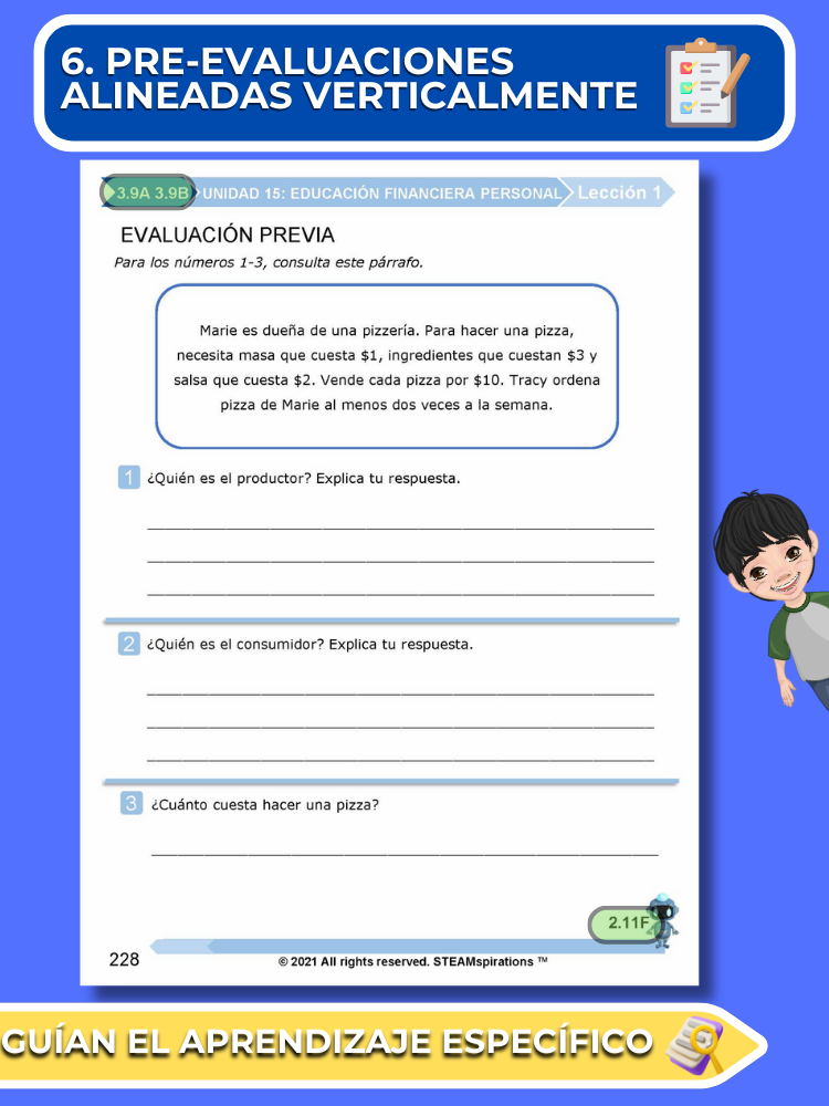 Pre-Evaluaciones Alineadas Verticalmente: Nuestro enfoque comienza cada unidad con una pre-evaluación sucinta que se alinea verticalmente con los nuevos TEKs introducidos, permitiendo un aprendizaje enfocado y efectivo.