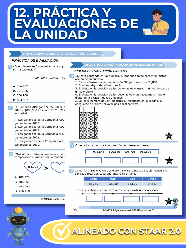 Prácticas y Evaluaciones de Unidades: Reflejando el rigor del examen STAAR, cada unidad incluye una evaluación de práctica y una evaluación de unidad integral con preguntas STAAR 2.0.