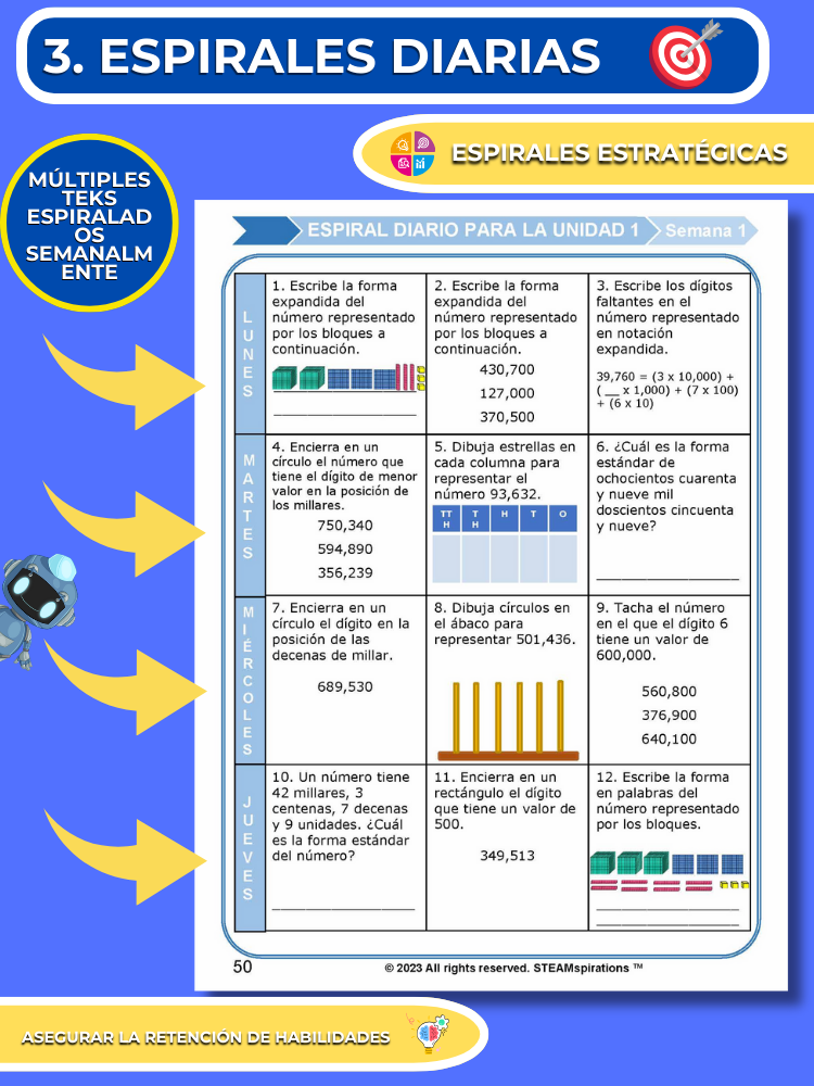 Espirales Diarias: Hemos estructurado nuestro programa de matemáticas para garantizar una revisión continua al volver a visitar todas las habilidades previamente enseñadas cada semana, asegurando así el dominio. Normalmente, para la séptima unidad, los estudiantes están revisando más de 15 habilidades quincenalmente, cubriendo todo el material de las primeras cuatro unidades. (Resaltar espiral diaria por TEKS)