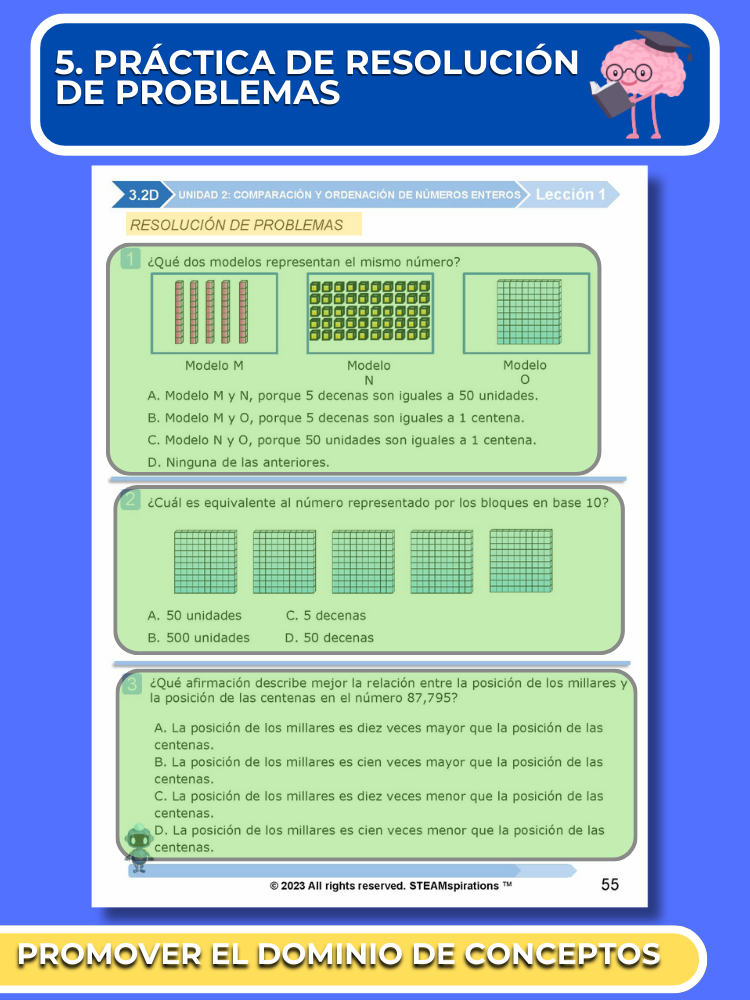 Preguntas de Resolución de Problemas: Más allá de las espirales diarias, cada lección incluye preguntas de resolución de problemas, también conocidas como preguntas del Problema del Día (P.O.D.), que refuerzan las habilidades de la lección enseñada previamente.