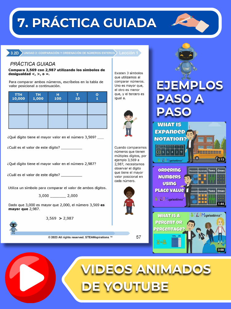 Práctica Guiada: Cada unidad incluye secciones de práctica guiada diseñadas para enseñar efectivamente nuevos TEKs/Habilidades. Estas se pueden utilizar junto con nuestros atractivos videos de instrucción animados, mejorando la experiencia de aprendizaje.