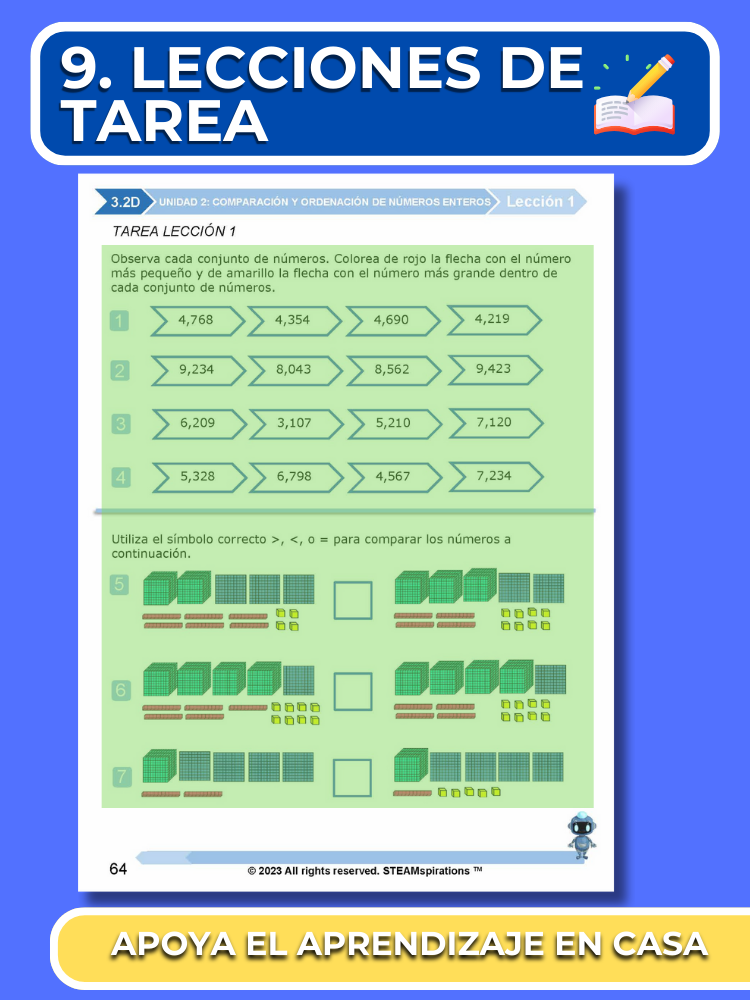 Vocabulario de Matemáticas y Preguntas Guiadas: Cada unidad introduce nuevo vocabulario de matemáticas y preguntas guiadas que pueden servir como objetivo del día o metas diarias para los maestros. Este enfoque mejora la comprensión y aplicación de conceptos y términos matemáticos, facilitando una comunicación más clara y un aprendizaje más profundo.