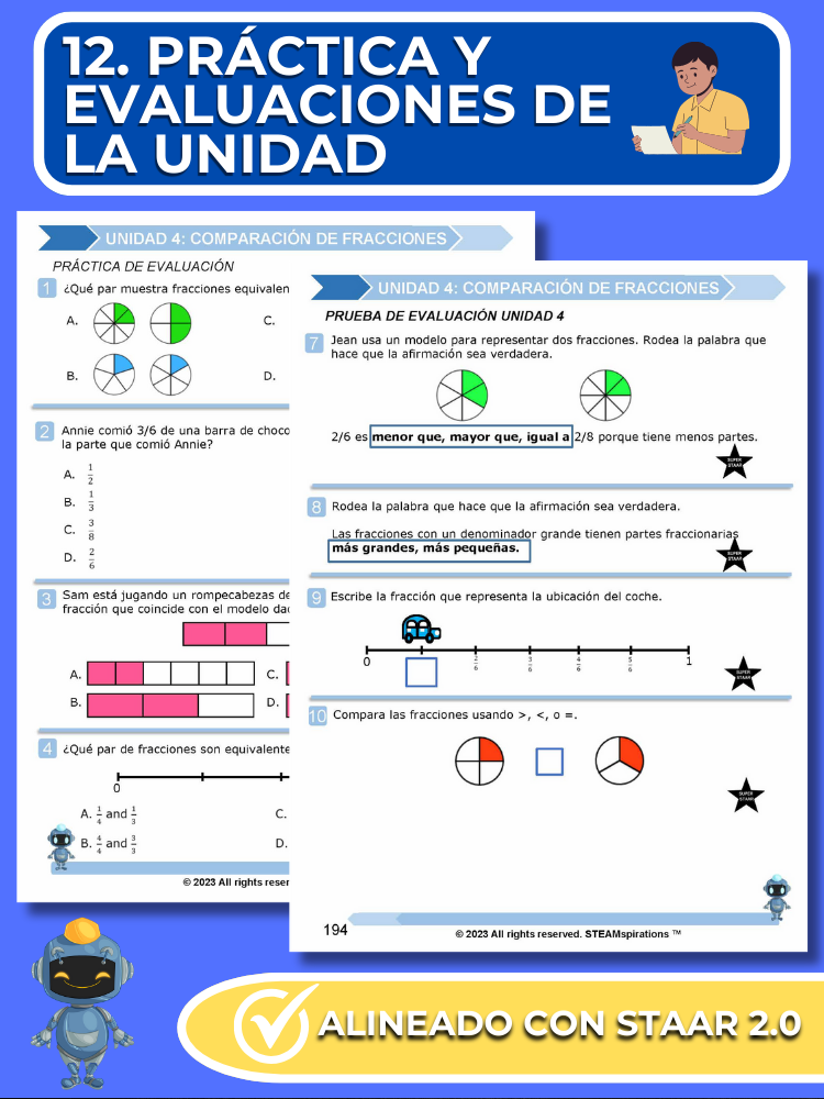 Prácticas y Evaluaciones de Unidades: Reflejando el rigor del examen STAAR, cada unidad incluye una evaluación de práctica y una evaluación de unidad integral con preguntas STAAR 2.0.