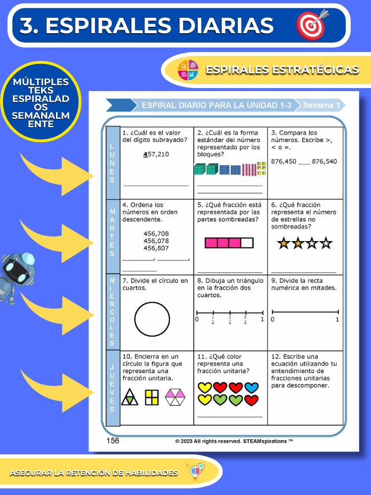 Espirales Diarias: Hemos estructurado nuestro programa de matemáticas para garantizar una revisión continua al volver a visitar todas las habilidades previamente enseñadas cada semana, asegurando así el dominio. Normalmente, para la séptima unidad, los estudiantes están revisando más de 15 habilidades quincenalmente, cubriendo todo el material de las primeras cuatro unidades. (Resaltar espiral diaria por TEKS)