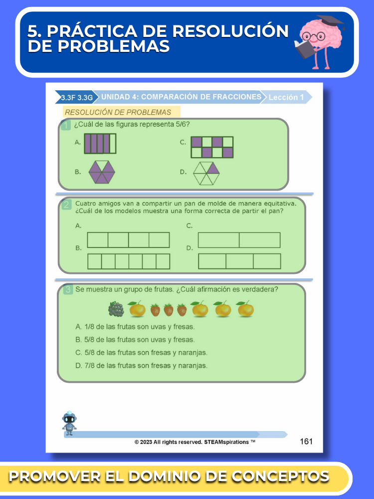 Preguntas de Resolución de Problemas: Más allá de las espirales diarias, cada lección incluye preguntas de resolución de problemas, también conocidas como preguntas del Problema del Día (P.O.D.), que refuerzan las habilidades de la lección enseñada previamente.