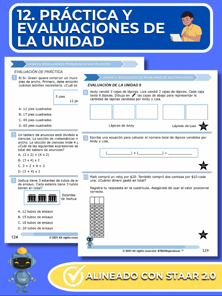 Prácticas y Evaluaciones de Unidades: Reflejando el rigor del examen STAAR, cada unidad incluye una evaluación de práctica y una evaluación de unidad integral con preguntas STAAR 2.0.