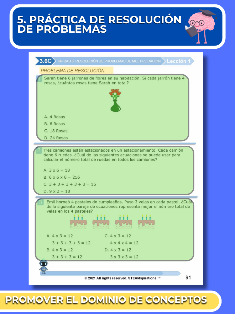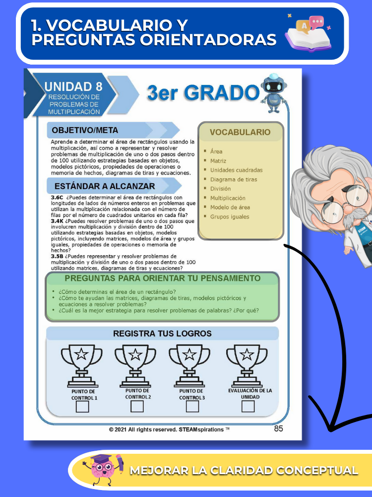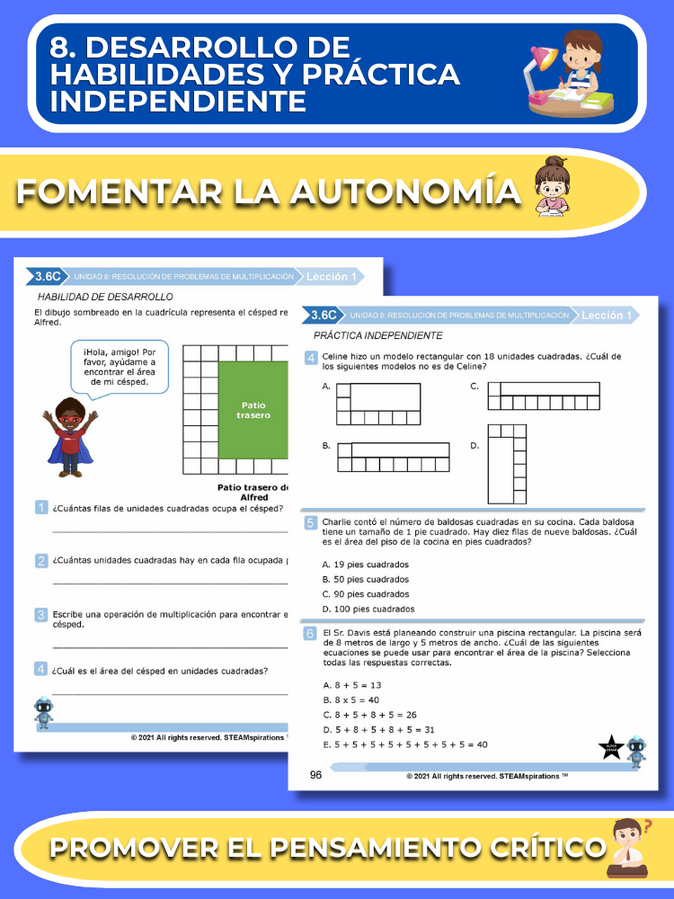 Práctica Guiada: Cada unidad incluye secciones de práctica guiada diseñadas para enseñar efectivamente nuevos TEKs/Habilidades. Estas se pueden utilizar junto con nuestros atractivos videos de instrucción animados, mejorando la experiencia de aprendizaje.