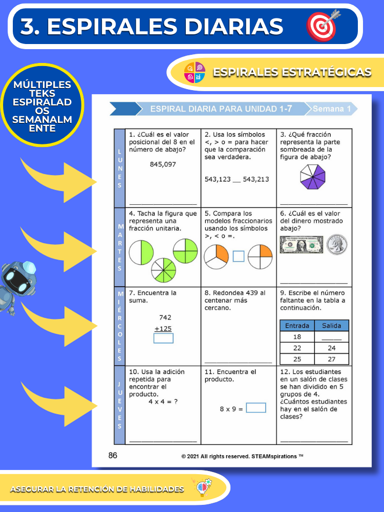 Espirales Diarias: Hemos estructurado nuestro programa de matemáticas para garantizar una revisión continua al volver a visitar todas las habilidades previamente enseñadas cada semana, asegurando así el dominio. Normalmente, para la séptima unidad, los estudiantes están revisando más de 15 habilidades quincenalmente, cubriendo todo el material de las primeras cuatro unidades. (Resaltar espiral diaria por TEKS)