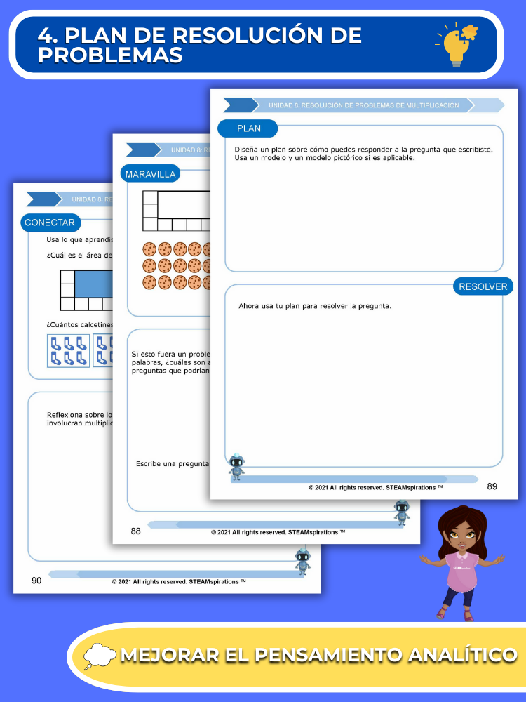 Proceso de Resolución de Problemas: Cada unidad presenta a los estudiantes un proceso de resolución de problemas que provoca curiosidad y mejora las habilidades de pensamiento analítico.