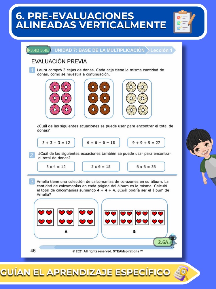 Pre-Evaluaciones Alineadas Verticalmente: Nuestro enfoque comienza cada unidad con una pre-evaluación sucinta que se alinea verticalmente con los nuevos TEKs introducidos, permitiendo un aprendizaje enfocado y efectivo.