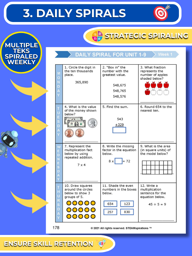 - Daily Spirals: We have structured our math program to ensure continuous review by revisiting all previously taught skills each week, thus ensuring mastery. Normally, by the 7th unit, students are reviewing over 15 skills bi-weekly, covering all material from the first four units. (HIghlight daily spiral by teks.