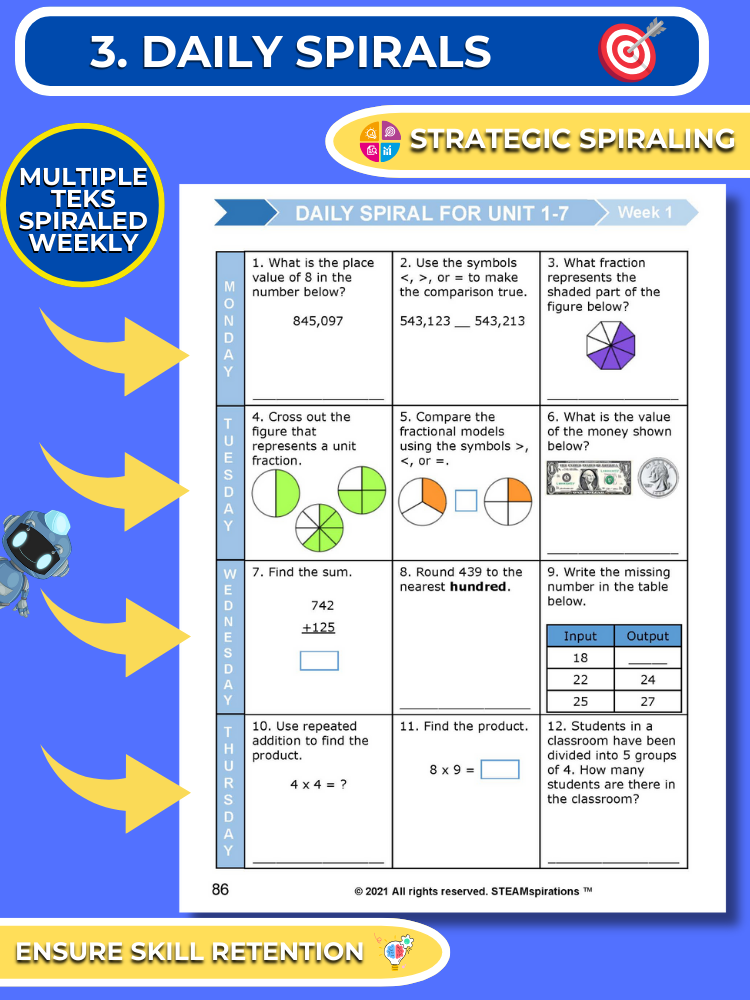 - Daily Spirals: We have structured our math program to ensure continuous review by revisiting all previously taught skills each week, thus ensuring mastery. Normally, by the 7th unit, students are reviewing over 15 skills bi-weekly, covering all material from the first four units. (HIghlight daily spiral by teks.