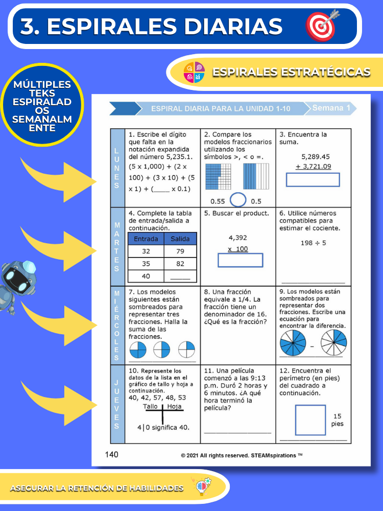 Espirales Diarias: Hemos estructurado nuestro programa de matemáticas para garantizar una revisión continua al volver a visitar todas las habilidades previamente enseñadas cada semana, asegurando así el dominio. Normalmente, para la séptima unidad, los estudiantes están revisando más de 15 habilidades quincenalmente, cubriendo todo el material de las primeras cuatro unidades. (Resaltar espiral diaria por TEKS)