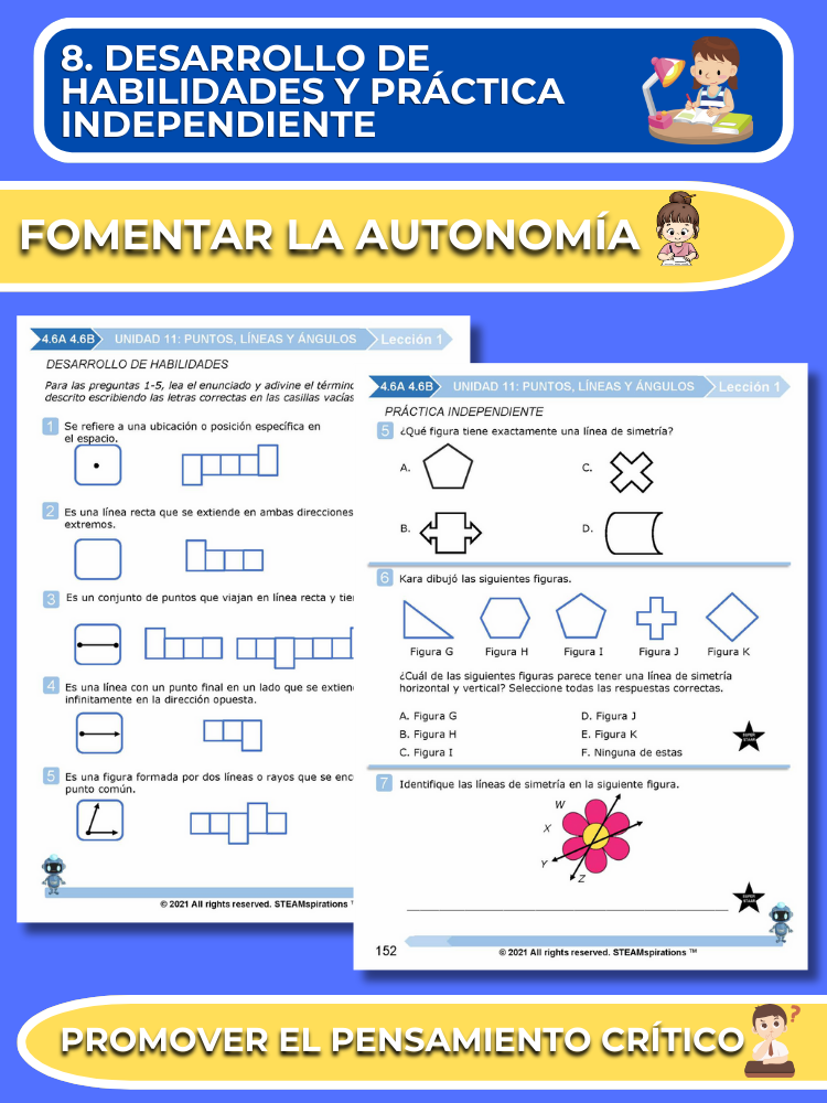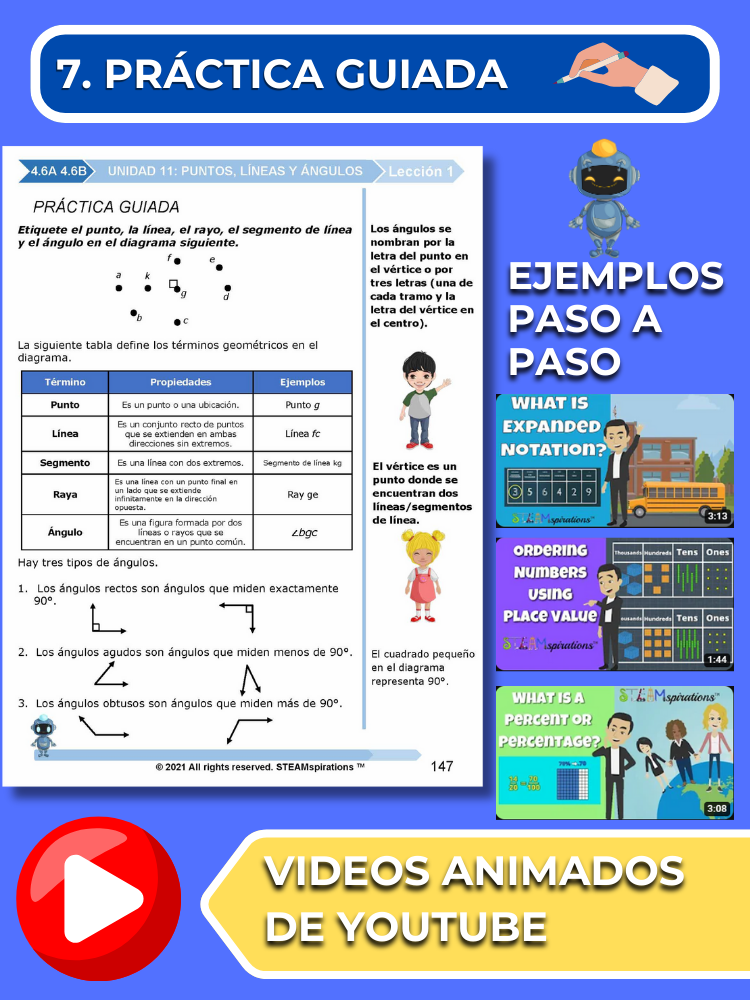 Práctica Guiada: Cada unidad incluye secciones de práctica guiada diseñadas para enseñar efectivamente nuevos TEKs/Habilidades. Estas se pueden utilizar junto con nuestros atractivos videos de instrucción animados, mejorando la experiencia de aprendizaje.