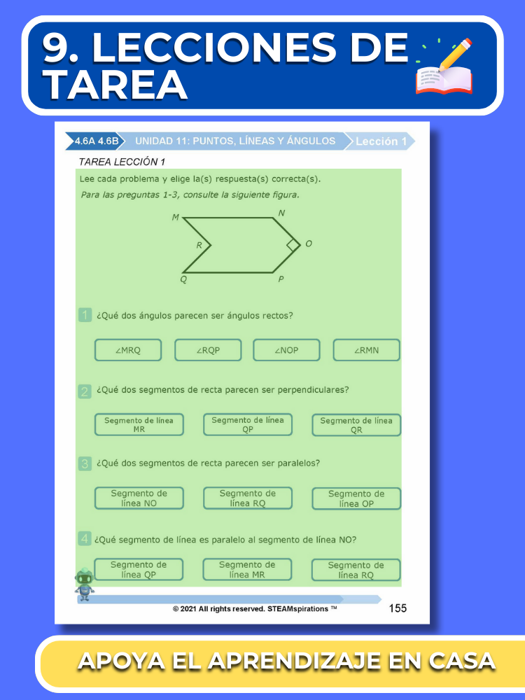 Construcción de Habilidades/Práctica Independiente: Las lecciones están diseñadas para fortalecer las habilidades matemáticas y las habilidades de resolución de problemas de los estudiantes a través de problemas de palabras, incluyendo preguntas STAAR 2.0 marcadas con un pequeño símbolo de estrella.