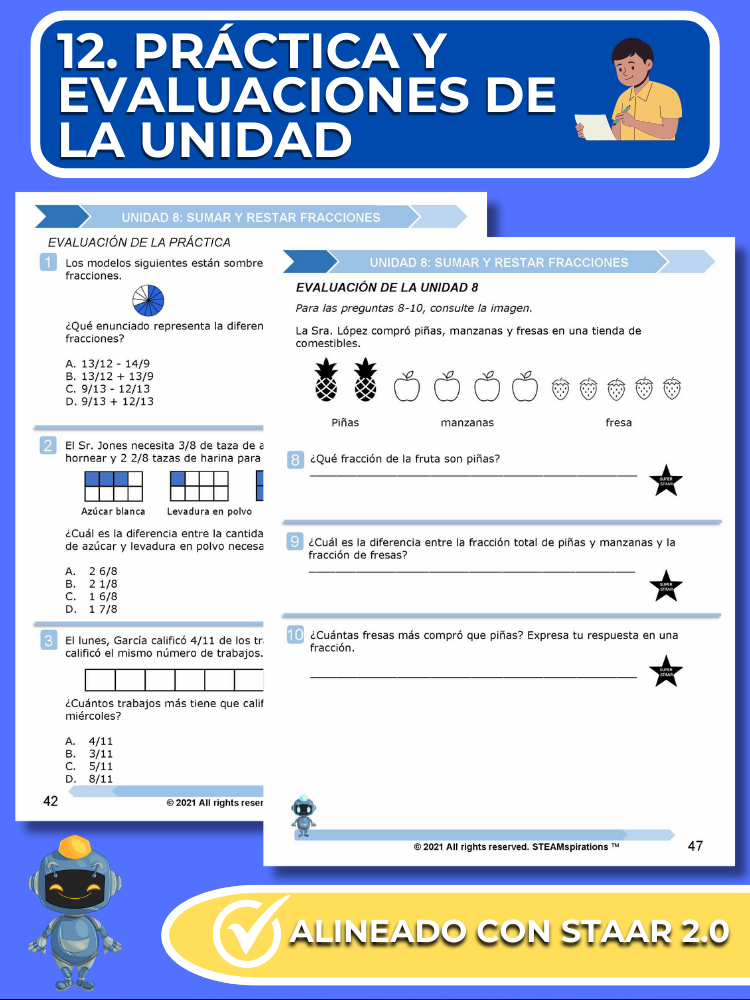 Prácticas y Evaluaciones de Unidades: Reflejando el rigor del examen STAAR, cada unidad incluye una evaluación de práctica y una evaluación de unidad integral con preguntas STAAR 2.0.