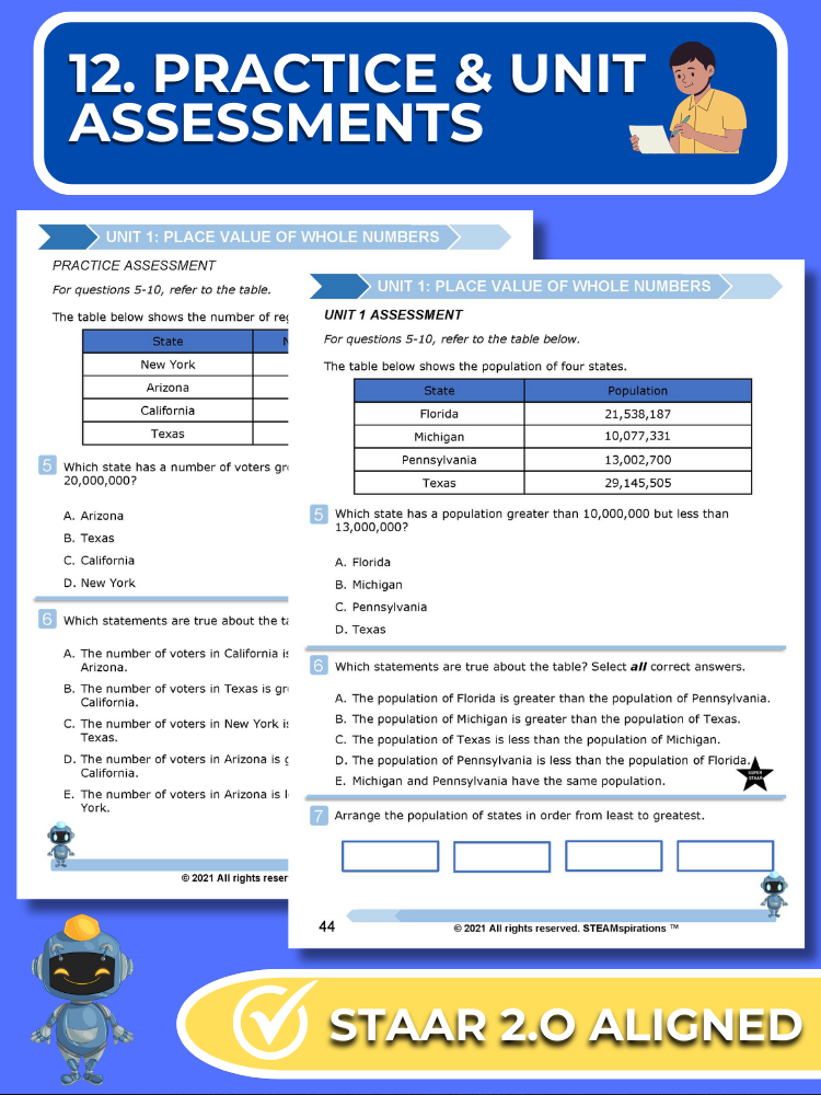 Practice and Unit Assessments: Reflecting the STAAR test's rigor, each unit includes a practice assessment and a comprehensive unit assessment featuring STAAR 2.0 questions.