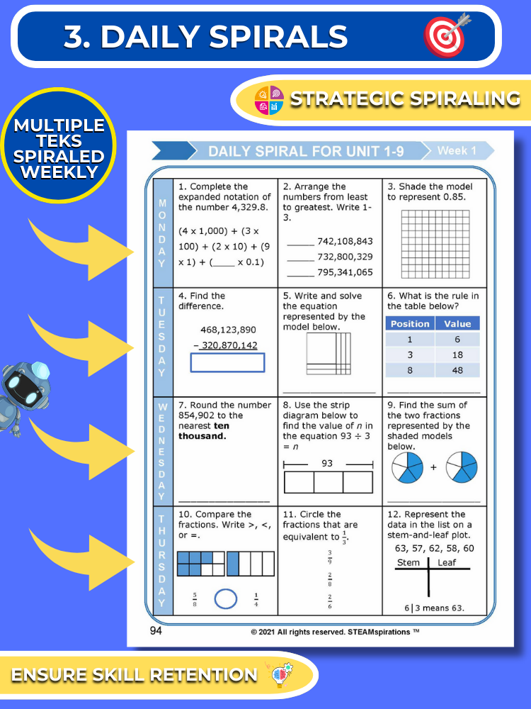 - Daily Spirals: We have structured our math program to ensure continuous review by revisiting all previously taught skills each week, thus ensuring mastery. Normally, by the 7th unit, students are reviewing over 15 skills bi-weekly, covering all material from the first four units. (HIghlight daily spiral by teks.