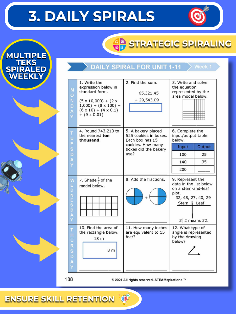 - Daily Spirals: We have structured our math program to ensure continuous review by revisiting all previously taught skills each week, thus ensuring mastery. Normally, by the 7th unit, students are reviewing over 15 skills bi-weekly, covering all material from the first four units. (HIghlight daily spiral by teks.