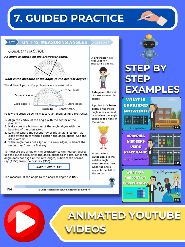 - Guided Practice: Every unit includes guided practice sections designed to effectively teach new TEKs/Skills. These can be utilized alongside our engaging animated instructional videos, enhancing the learning experience.