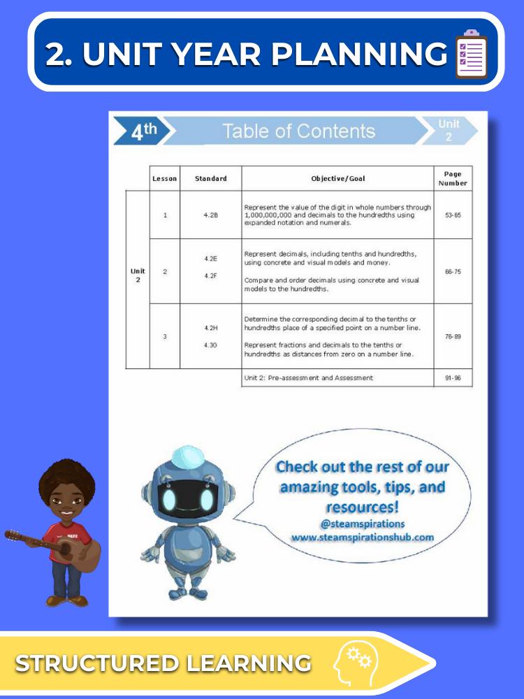 - Unit Year Planning: Our curriculum breaks down each TEK into manageable segments, scaffolding learning for complete mastery. This methodical approach allows students to fully understand each part of the TEK as it is taught throughout the lessons, making the process more straightforward for educators.