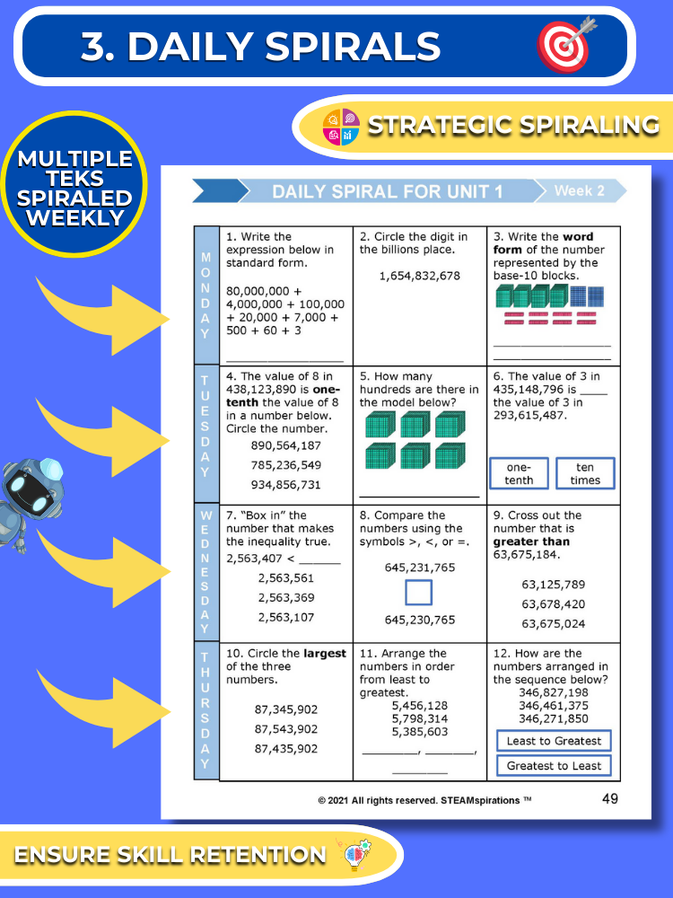 - Daily Spirals: We have structured our math program to ensure continuous review by revisiting all previously taught skills each week, thus ensuring mastery. Normally, by the 7th unit, students are reviewing over 15 skills bi-weekly, covering all material from the first four units. (HIghlight daily spiral by teks.