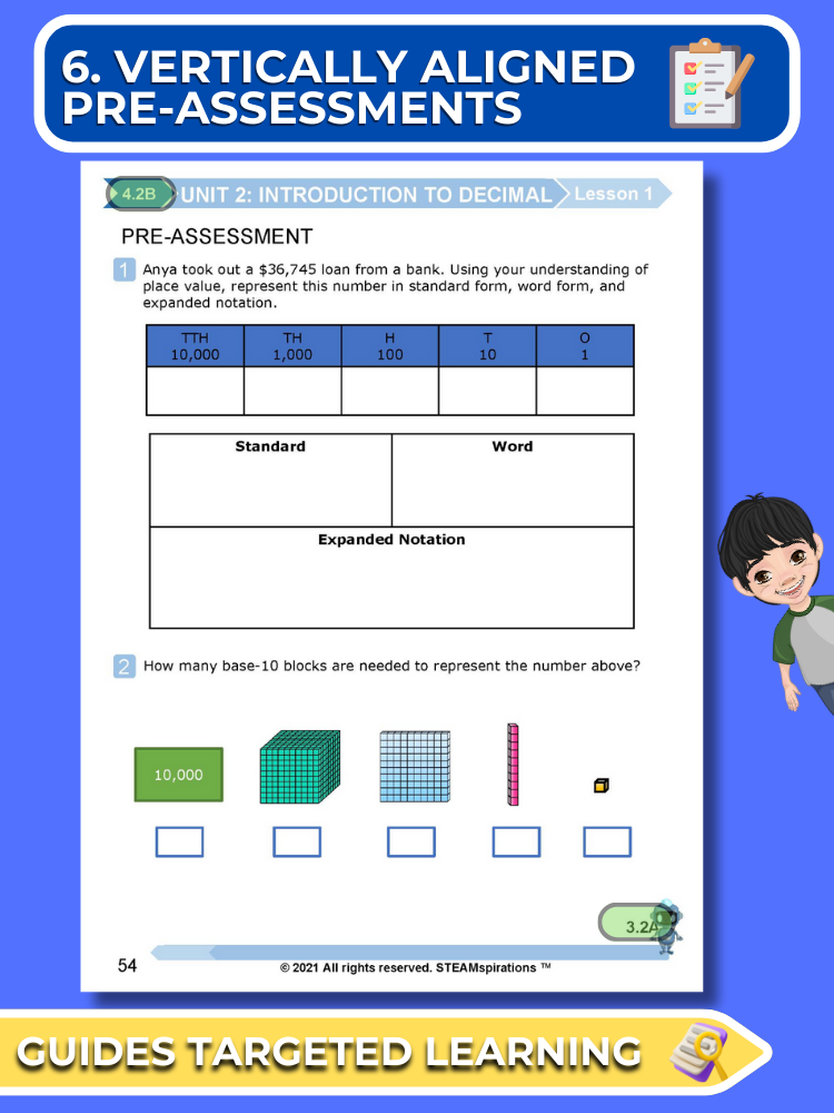- Vertically Aligned Pre-Assessments: Our approach begins each unit with a succinct pre-assessment that aligns vertically with the new TEKs introduced, enabling focused and effective learning.