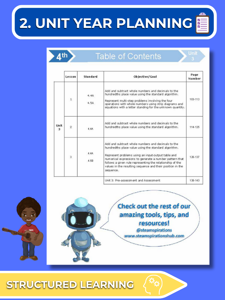 - Unit Year Planning: Our curriculum breaks down each TEK into manageable segments, scaffolding learning for complete mastery. This methodical approach allows students to fully understand each part of the TEK as it is taught throughout the lessons, making the process more straightforward for educators.