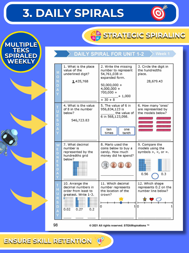 - Daily Spirals: We have structured our math program to ensure continuous review by revisiting all previously taught skills each week, thus ensuring mastery. Normally, by the 7th unit, students are reviewing over 15 skills bi-weekly, covering all material from the first four units. (HIghlight daily spiral by teks.