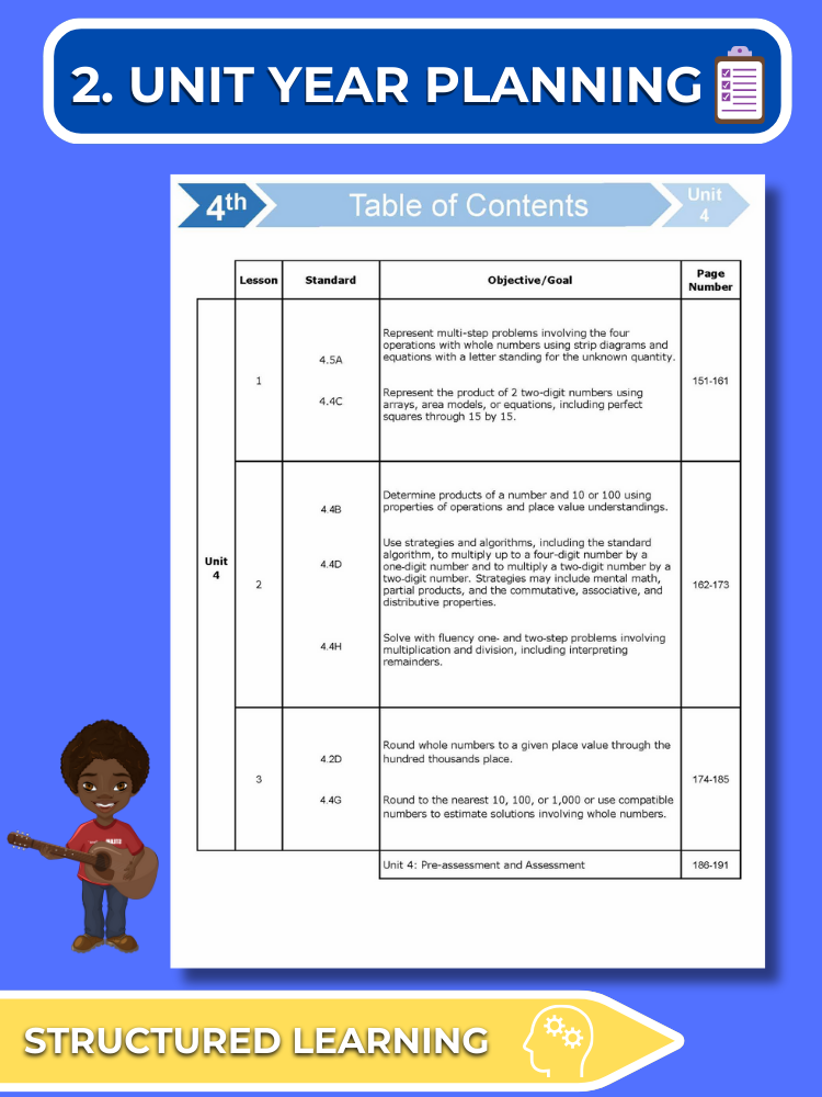 - Unit Year Planning: Our curriculum breaks down each TEK into manageable segments, scaffolding learning for complete mastery. This methodical approach allows students to fully understand each part of the TEK as it is taught throughout the lessons, making the process more straightforward for educators.