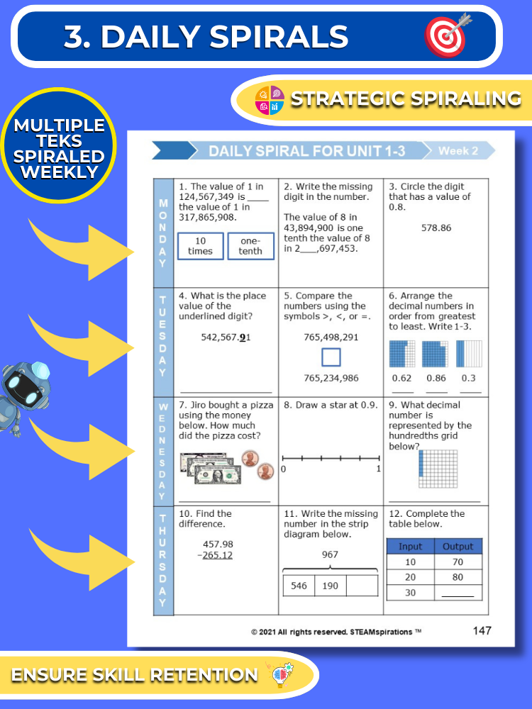 - Daily Spirals: We have structured our math program to ensure continuous review by revisiting all previously taught skills each week, thus ensuring mastery. Normally, by the 7th unit, students are reviewing over 15 skills bi-weekly, covering all material from the first four units. (HIghlight daily spiral by teks.