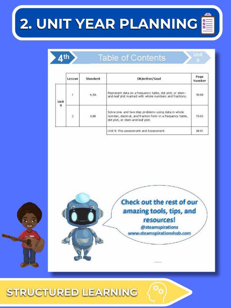 - Unit Year Planning: Our curriculum breaks down each TEK into manageable segments, scaffolding learning for complete mastery. This methodical approach allows students to fully understand each part of the TEK as it is taught throughout the lessons, making the process more straightforward for educators.