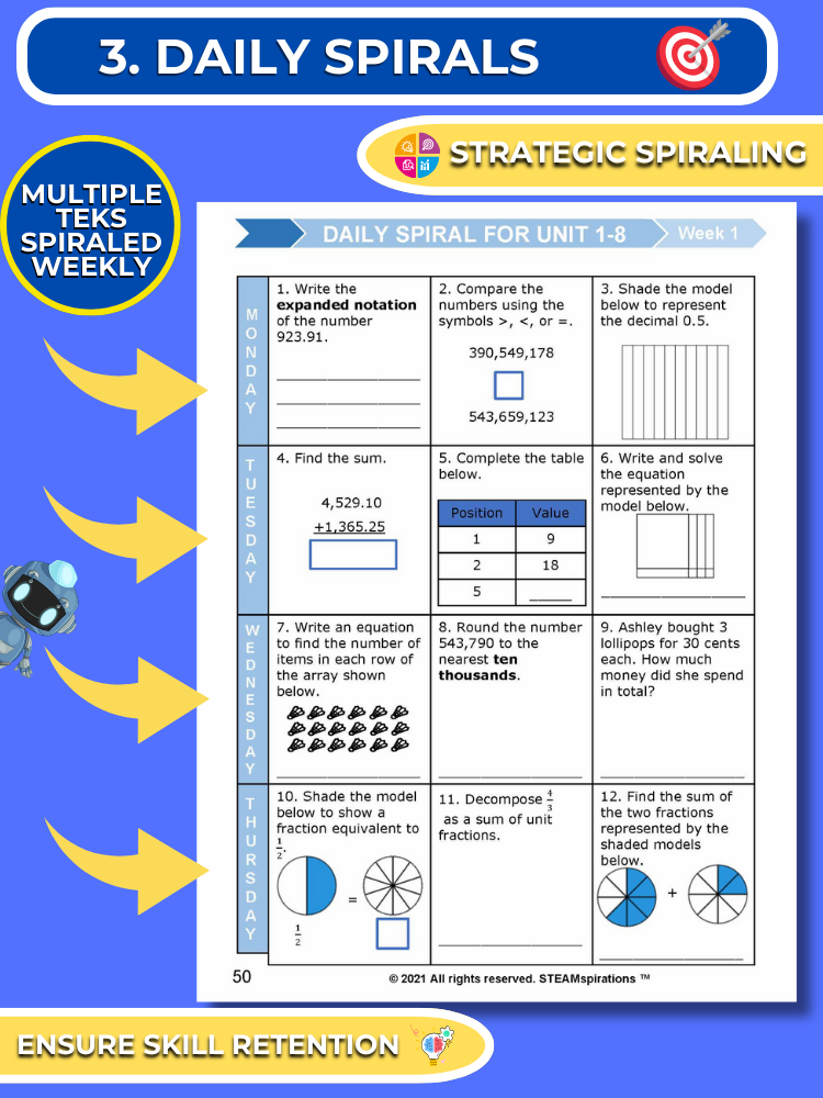 - Daily Spirals: We have structured our math program to ensure continuous review by revisiting all previously taught skills each week, thus ensuring mastery. Normally, by the 7th unit, students are reviewing over 15 skills bi-weekly, covering all material from the first four units. (HIghlight daily spiral by teks.