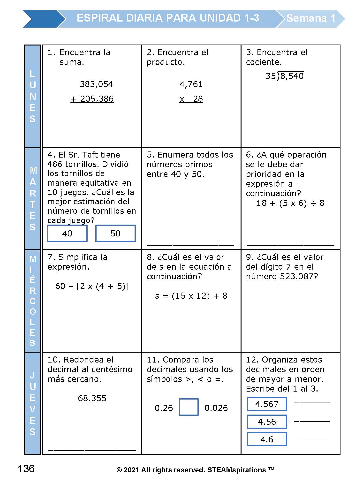 Preguntas de Resolución de Problemas: Más allá de las espirales diarias, cada lección incluye preguntas de resolución de problemas, también conocidas como preguntas del Problema del Día (P.O.D.), que refuerzan las habilidades de la lección enseñada previamente.