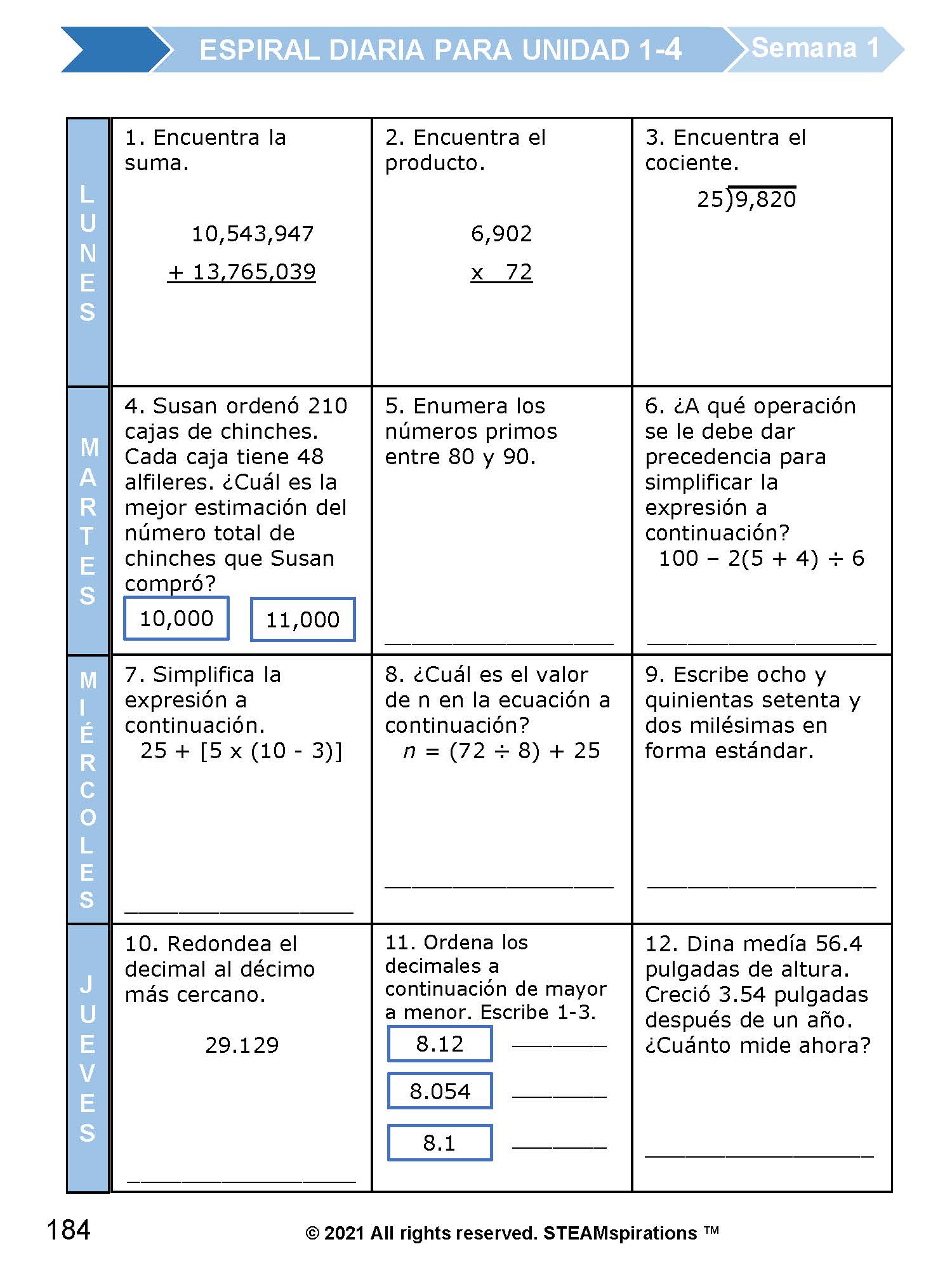 Preguntas de Resolución de Problemas: Más allá de las espirales diarias, cada lección incluye preguntas de resolución de problemas, también conocidas como preguntas del Problema del Día (P.O.D.), que refuerzan las habilidades de la lección enseñada previamente.