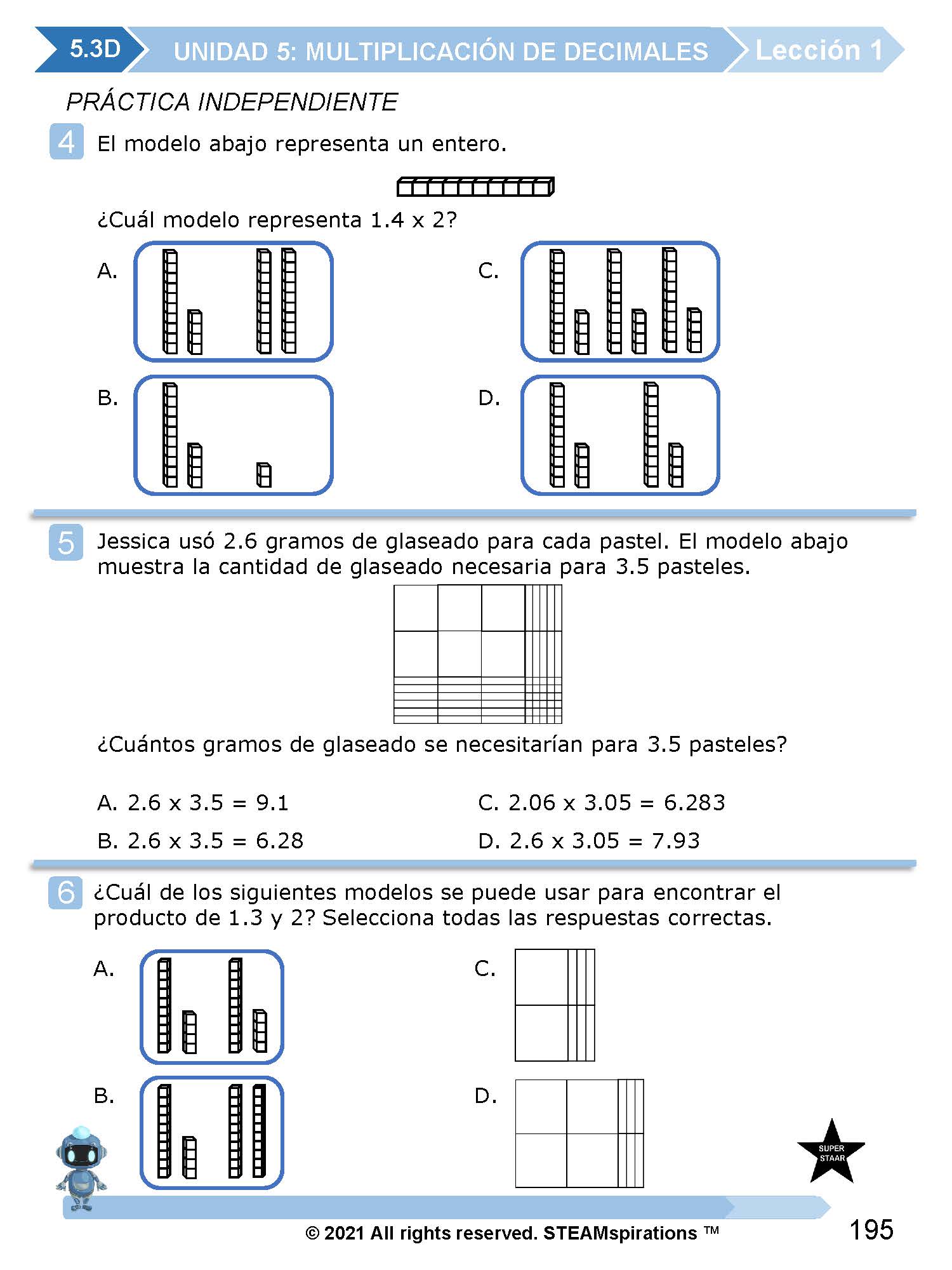 Construcción de Habilidades/Práctica Independiente: Las lecciones están diseñadas para fortalecer las habilidades matemáticas y las habilidades de resolución de problemas de los estudiantes a través de problemas de palabras, incluyendo preguntas STAAR 2.0 marcadas con un pequeño símbolo de estrella.