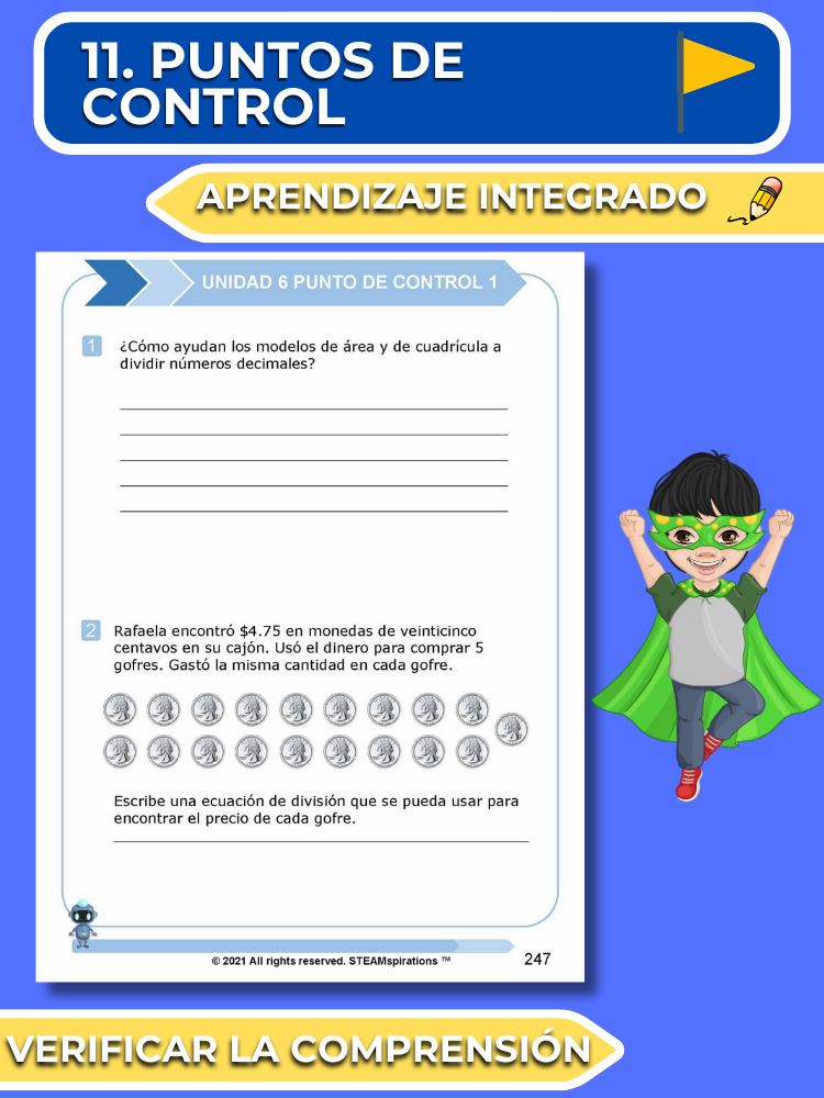 Puntos de Control: Al final de cada lección, los puntos de control incluyen un ejercicio de escritura y una pregunta de resolución de problemas para evaluar la comprensión y consolidar el aprendizaje.