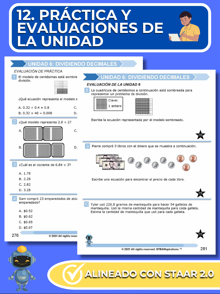 Prácticas y Evaluaciones de Unidades: Reflejando el rigor del examen STAAR, cada unidad incluye una evaluación de práctica y una evaluación de unidad integral con preguntas STAAR 2.0.