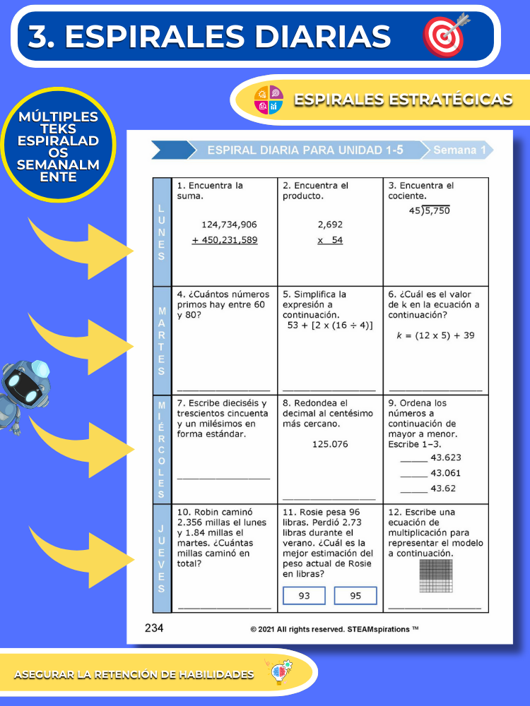 Espirales Diarias: Hemos estructurado nuestro programa de matemáticas para garantizar una revisión continua al volver a visitar todas las habilidades previamente enseñadas cada semana, asegurando así el dominio. Normalmente, para la séptima unidad, los estudiantes están revisando más de 15 habilidades quincenalmente, cubriendo todo el material de las primeras cuatro unidades. (Resaltar espiral diaria por TEKS)