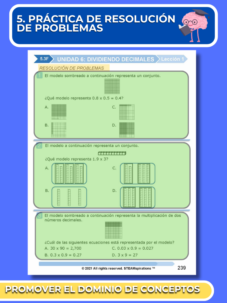 Preguntas de Resolución de Problemas: Más allá de las espirales diarias, cada lección incluye preguntas de resolución de problemas, también conocidas como preguntas del Problema del Día (P.O.D.), que refuerzan las habilidades de la lección enseñada previamente.