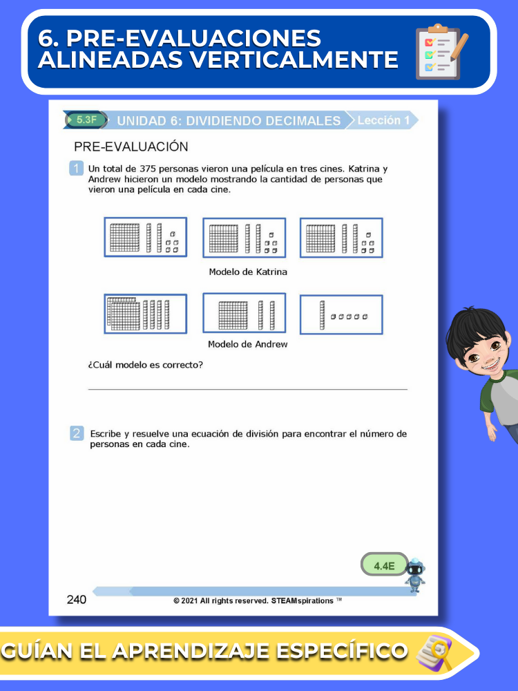 Pre-Evaluaciones Alineadas Verticalmente: Nuestro enfoque comienza cada unidad con una pre-evaluación sucinta que se alinea verticalmente con los nuevos TEKs introducidos, permitiendo un aprendizaje enfocado y efectivo.