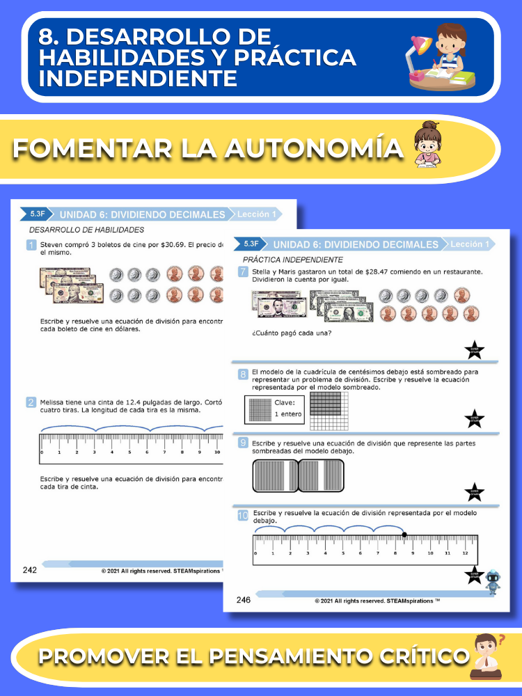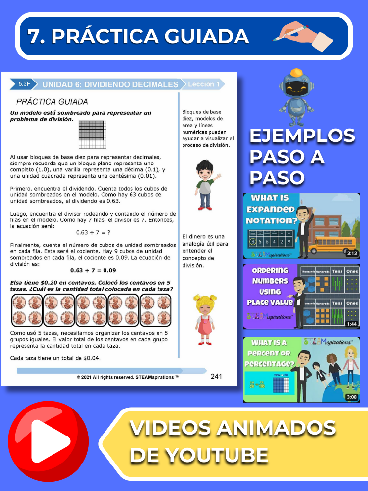 Práctica Guiada: Cada unidad incluye secciones de práctica guiada diseñadas para enseñar efectivamente nuevos TEKs/Habilidades. Estas se pueden utilizar junto con nuestros atractivos videos de instrucción animados, mejorando la experiencia de aprendizaje.
