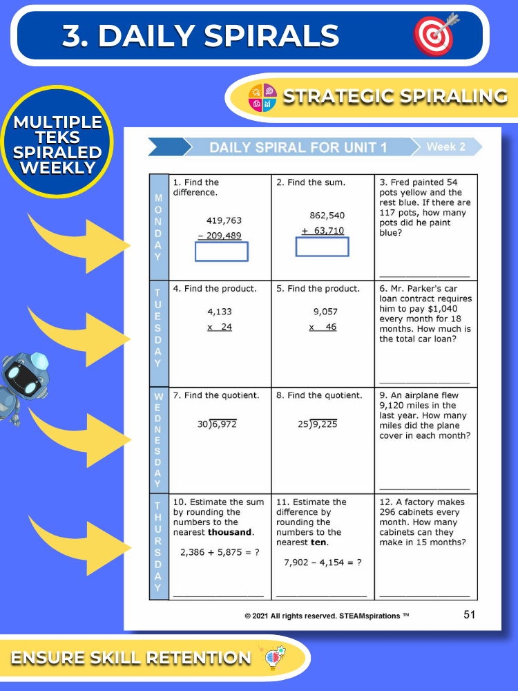 - Daily Spirals: We have structured our math program to ensure continuous review by revisiting all previously taught skills each week, thus ensuring mastery. Normally, by the 7th unit, students are reviewing over 15 skills bi-weekly, covering all material from the first four units. (HIghlight daily spiral by teks.
