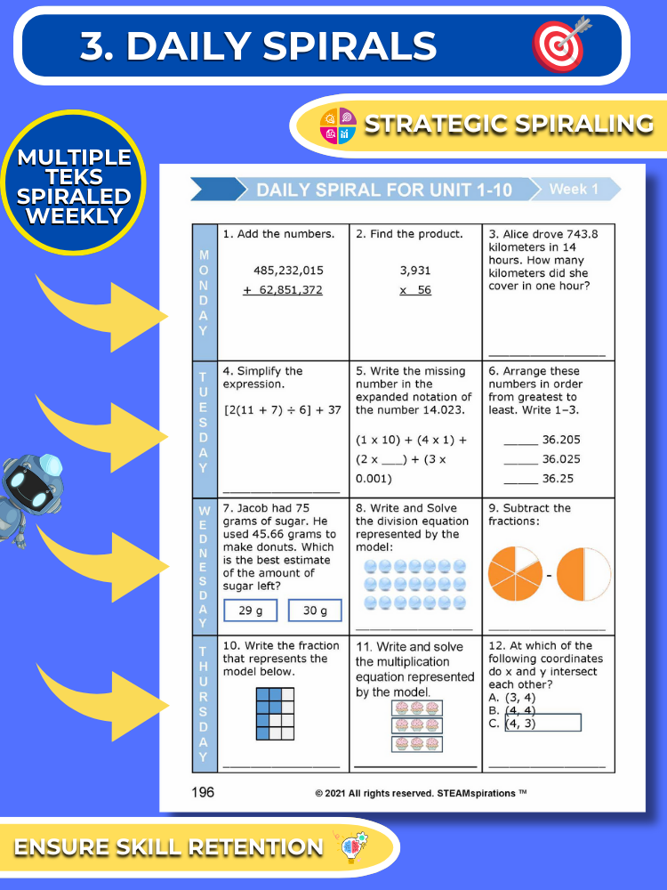 - Daily Spirals: We have structured our math program to ensure continuous review by revisiting all previously taught skills each week, thus ensuring mastery. Normally, by the 7th unit, students are reviewing over 15 skills bi-weekly, covering all material from the first four units. (HIghlight daily spiral by teks.